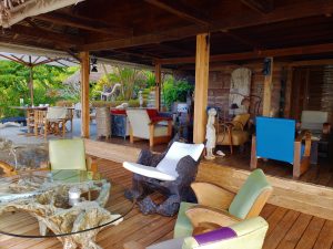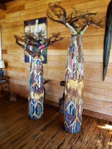 The auction consisted of pieces of indigenous Malagasy art embellished by well-known French artists. Most of the pieces were wood carvings by the Zafimaniry people from the village of Antoetra where DVDH has a rebuilding project. The enhanced pieces were really interesting, but looking around me, I realized how rich were the unenhanced wooden pieces hanging everywhere on the walls of the lodge and placed strategically on tabletops and shelving. When we first arrived, I had noticed two large spectacularly painted metal sculptures of baobab trees prominently positioned at top of the stairs. They look like they had been retrieved from the auction.