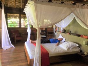 We enjoyed a light lunch accompanied by a delicious pineapple daiquiri. Then I started to feel utterly exhausted and sick with diarrhea. Maryse made me a concoction of warm water, lemon, sugar and salt which helped, but later I still couldn’t make it through dinner so I retreated to our beautiful mosquito netted, canopied king size bed and slept like the dead.