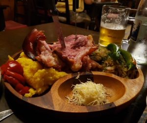 Noel and I passed on an opportunity to tour the inside of the parliament building and opted to spend our free afternoon exploring the city center and its eateries. We settled on a popular restaurant and bar called Caru’ cu bere that has been operating since 1879. We chose to share the smoked pig’s knuckle with polenta and vegetables. It was mammoth, to say the least. We were totally baffled on how to begin when the server brought it out, but fortunately another server offered to cut the meat off the bone for us, so it wasn’t quite so formidable. It was delicious but we could only eat half of it. It would have been perfect for a family of four.